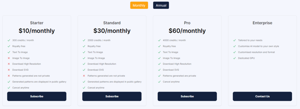 AI-generated seamless patterns, high-resolution & SVG downloads, pattern customization, repeatable unique patterns, text to pattern conversion, dedicated GPU for enterprise, customizable AI model, public gallery of generated patterns, usage analytics.